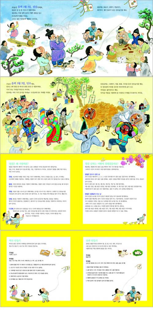 ‘설날’과 ‘추석’ 말고 어린이들은 명절을 몇 가지나 알고 있을까요? 대보름, 단오, 칠석, 중양절 등도 명절이라는 사실을 제대로 알고 있는 어린이는 드물겠지요. 그나마 공휴일로 지정하여 명절로 맞이하는 설날은 ‘세뱃돈’을 받는 날, 추석은 ‘송편’을 빚는 날 정도로만 알고 있는 게 고작입니다. 하지만 농사가 나라의 근간이었던 우리 조상에게 명절이란 농사철의 주요 시기마다 풍년을 기원하며 하늘에 복을 비는 중요한 행사였습니다. 계절의 변화에 맞춰 조상께 인사를 드리고 한 해 동안 가족의 안녕과 복을 기원하고, 풍성하게 차린 맛있는 음식을 가족이나 친지, 이웃들과 나누어 먹었습니다. 또 재미있는 놀이를 즐기기도 했지요.